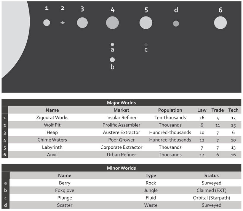 The worlds fully detailed in their system section are major worlds. Other worlds are minor worlds, either barely inhabited or uninhabited. For those not detailed, roll d12 and d6, consulting the following tables: